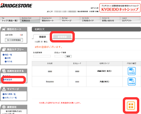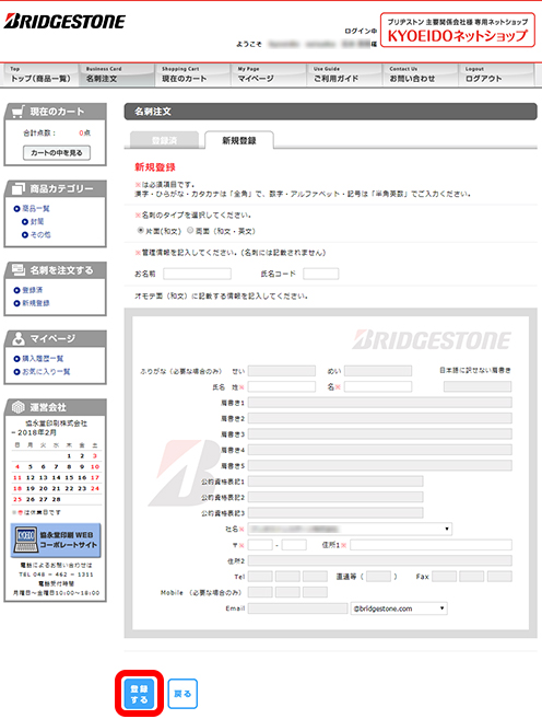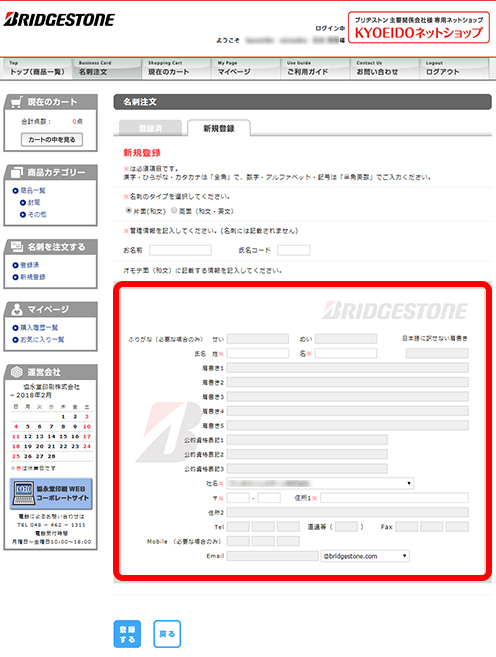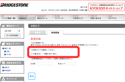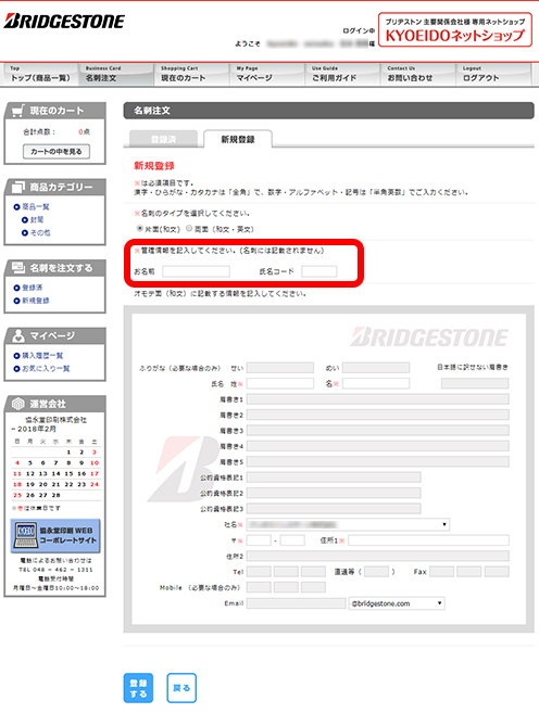 名刺を作成される方の「お名前」と「氏名コード」を入力します。