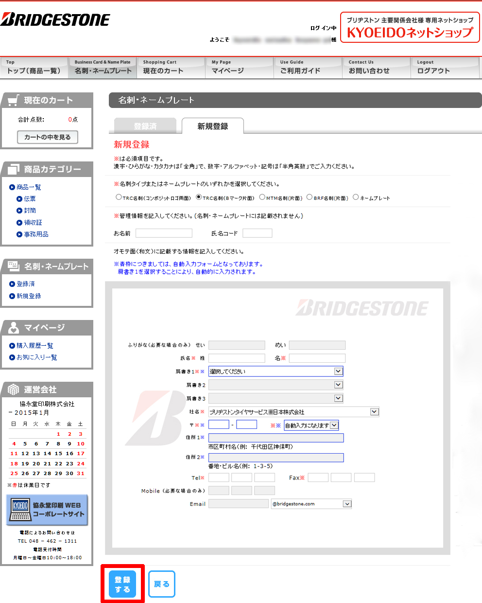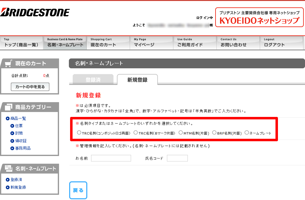「TRC名刺(コンポジットロゴ両面)」、「TRC名刺(Bマーク片面)」、「MTM名刺(片面)」、「BRF名刺(片面)」